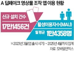 앱 데이터 분석 플랫폼인 모바일인덱스에 따르면 성희롱성 딥페이크 앱 가운데 사용자가 가장 많은 A앱은 2023년 3월 출시 이후 지난달까지 누적 다운로드 수가 17만1456건에 달했다. 월간활성이용자(MAU)도 1만4358명으로 집계됐다. 영상물 한 건 제작에 2000원을 부과하고 있어 매출도 상당할 것으로 추정된다. 구글 플레이스토어 사진 부문 앱 매출 순위에서 전체 9위에 올랐다.