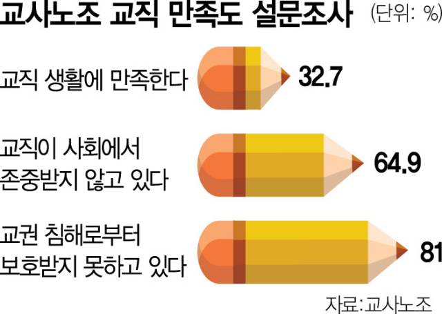 스승의 날마저 금기시하는 분위기 속에 교사 만족도는 바닥을 치고 있다. 전국교직원노동조합이 전국 교사 2503명을 대상으로 진행한 실태 조사 결과에 따르면 67%의 교사가 현재 근무 환경에 만족하지 않는다고 답변했다. 교권 침해로부터 보호받고 있다고 느끼지 못한다는 교사도 무려 81%에 달했다. 전교조는 “안정적인 교육 환경을 위한 교사의 근무 여건 개선이 시급하다”고 강조했다.