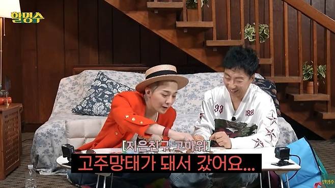박명수는 투어 중인 지드래곤에게 "게스트들도 나오냐. 게스트 감사의 표시는 뭐로 하냐"고 묻자 지드래곤은 "지은 친구가 잘 챙겨주지 않냐. 선물로 냉장고가 와 있는데, (아이유가) 광고하는 주류가 가득 채워져 있더라. 군대 가기 전이었는데, 고주망태가 돼서 갔다"라고 고백했다.