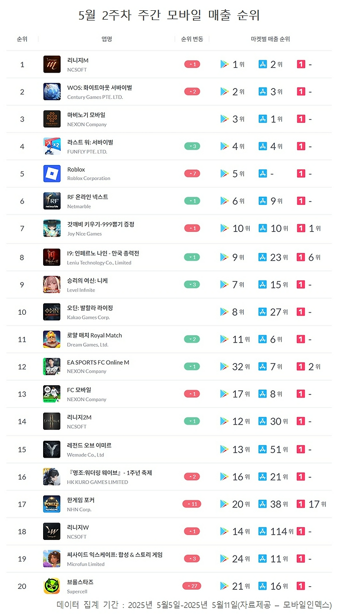 한 주간의 매출 순위를 알아보고 국내 모바일 게임 시장에 어떤 변화가 있었는지 확인하는 '주간모바일순위' 코너입니다. 구글 플레이와 애플 앱스토어, 원스토어 등 국내 3대 마켓에서의 모바일 게임 매출을 합산해 산출한 순위를 통해 매주 모바일 게임 시장 변화를 독자들에게 제공하고자 합니다. <편집자주>