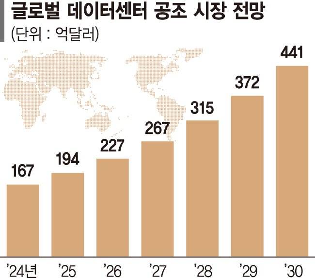 이 중 데이터센터 부문은 생성형 AI 서비스 확대에 따라 2030년까지 441억달러(약 62조5700억원) 규모로 연평균 18% 성장이 전망된다. 최근 AI 시대를 맞아 글로벌 기업들이 데이터센터나 반도체 공장 등 AI 후방산업에 대한 인프라 투자를 단행하고 있어서다. 데이터센터 내 24시간 풀가동 중인 수만대의 서버 열이 누적돼 성능저하, 고장, 데이터 손실로 이어지지 않도록 하는 열관리(냉각) 시스템을 포함한 공조장비의 중요도는 더 커지고 있다.