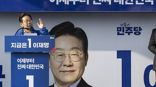 ▲ 더불어민주당 이재명 대선 후보가 14일 경남 통영시 강구안 문화마당에서 열린 유세에 참석해 지지를 호소하는 연설을 하고 있다.