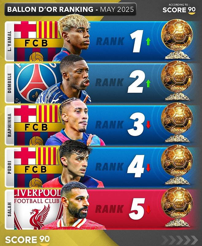 매체가 인용한 자료는 축구 콘텐츠 제작 매체 '스코어 90'이 자체적으로 선정한 파워랭킹이다. 야말이 1위, 우스만 뎀벨레(파리 생제르맹)가 2위, 하피냐가 3위, 페드리(이상 바르셀로나)가 4위, 모하메드 살라(리버풀)가 5위에 이름을 올렸다.