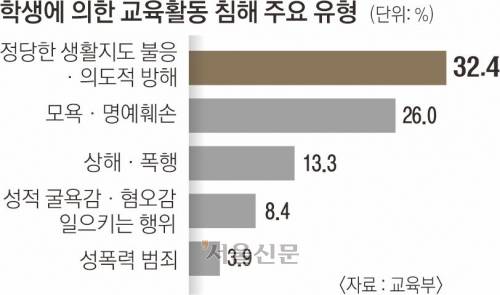 교사를 향한 폭언, 비난, 욕설은 이제 교실에서 흔한 풍경이 됐다. 교육부의 ‘2024학년도 교육활동 침해 실태조사’를 보면 학생에 의한 교육활동 침해 유형은 ▲정당한 생활지도 불응·의도적 수업 방해(32.4%) ▲모욕·명예훼손(26.0%) ▲상해·폭행(13.3%) 순으로 많았다. 대구의 한 초등학교 교사인 C씨도 수업 중 소셜미디어(SNS)를 하는 학생에게 자제하라고 했다가 욕설을 들었다. C씨는 “교장과 교감에게 이야기했지만 ‘네가 잘 지도했으면 그런 욕을 했겠냐’며 제 탓으로 돌렸다”고 전했다.
