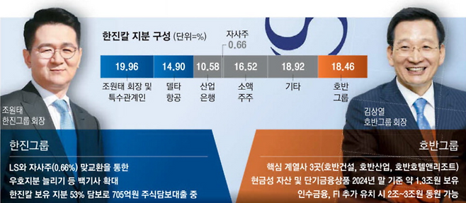 이로써 호반그룹 한진칼 지분율(18.46%)과 조원태 한진그룹 회장 및 특수관계인(19.96%)과의 지분 차이는 1.5%포인트로 좁혀졌다.