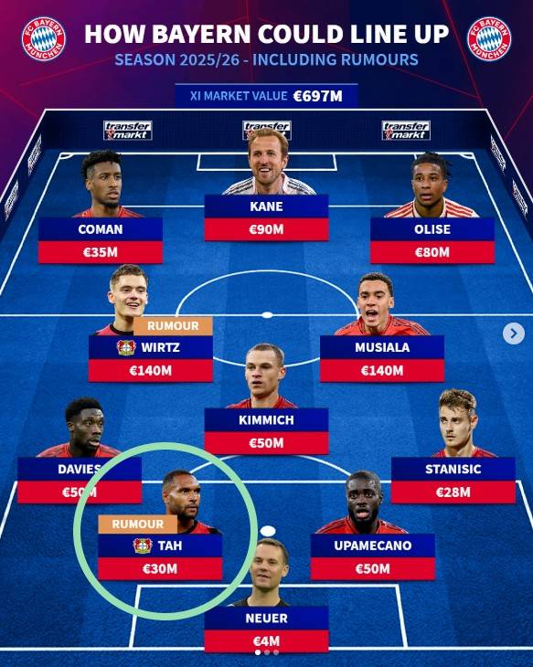 매체는 4-3-3 포메이션을 내세웠다. 공격에는 해리 케인, 킹슬리 코망, 마이클 올리세가 자리했다. 중원에는 플로리안 비르츠, 자말 무시알라, 요슈아 키미히가 배치됐다. 포백은 알폰소 데이비스, 요나단 타, 다요 우파메카노, 요시프 스타니시치가 이름을 올렸고, 골키퍼는 마누엘 노이어의 몫이었다.