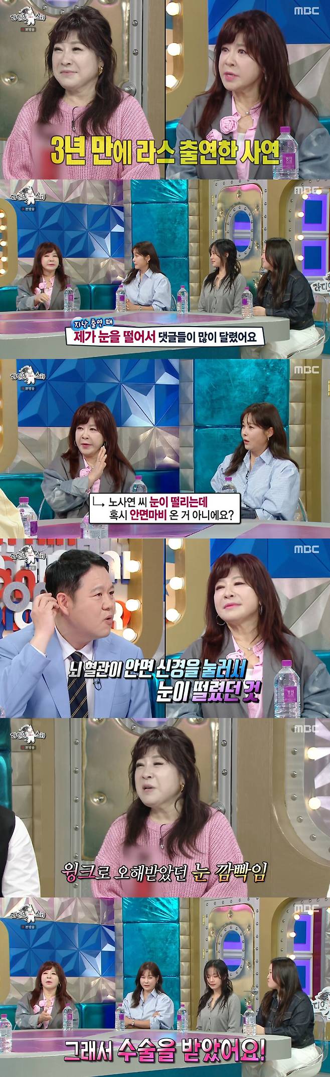 3년 만에 '라디오스타'에 출연한 노사연은 "지난 출연 때 눈을 떨어서 댓글들이 많이 달렸다"며 입을 열었다. 당시 눈 떨림 증상을 보여 걱정을 샀던 그는 "'노사연 씨 눈 떨리는데 혹시 안면마비 온 거 아니냐'는 댓글이 달리기도 했다"고 말했다.