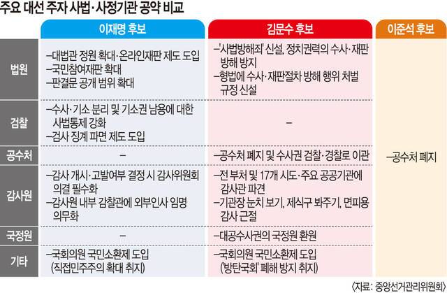 더불어민주당과 국민의힘이 6·3 대선을 앞두고 발표한 사법·사정기관 관련 공약은 ‘힘 빼기’와 ‘독립성 강화’로 확연히 갈린다. 이재명 후보는 ‘내란 극복’과 ‘민주주의 회복’을 명분으로 법원·검찰·감사원 권한 축소에 힘을 실었다. 김문수 후보는 이 후보를 겨눠 정치권력에 의한 수사·재판 방해 행위를 차단하겠다는 공약을 내세웠다.