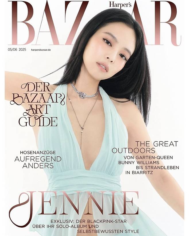 제니는 커버 사진에서 가슴까지 오픈 된 연한 블루 드레스에 두 가지 목걸이를 아래 위로 배치해 어느 정도의 노출과 특유의 고긊스러운 이미지를 연출하고 있다.