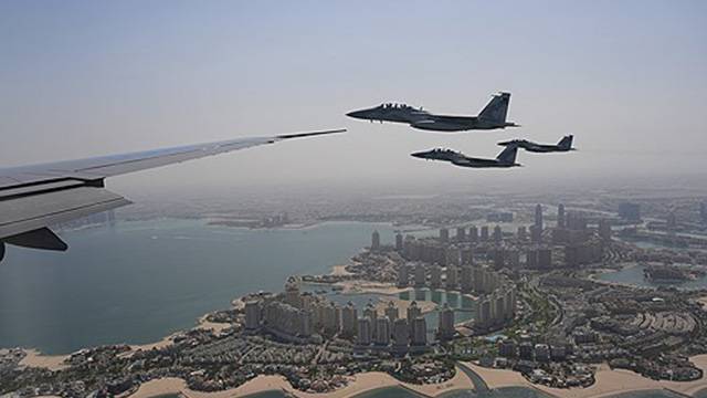 백악관 풀기자단과 외신 등에 따르면 트럼프 대통령은 14일(현지시각) 첫 방문국 사우디아라비아를 떠나 카타르로 이동하는 도중 대통령 전용기 옆으로 카타르 공군의 F-15 전투기가 호위했습니다.