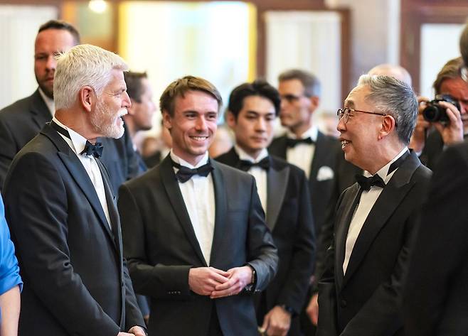 박지원 두산에너빌리티 회장(오른쪽)이 12일(현지 시간) 체코 ‘프라하의 봄 국제음악제’ 개막 공연 환영 행사에서 페트르 파벨 체코 대통령(왼쪽)과 만나 환담을 나누고 있다. 이 음악회는 1946년 시작돼 올해 80회를 맞았다. 두산에너빌리티는 체코 현지 자회사 두산스코다파워를 통해 이 음악회를 공식 후원한다.