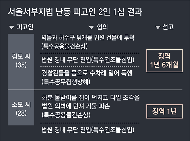1월 벌어진 서울 서부지방법원 난입 사건의 첫 형사재판 선고에서 피고인 2명에게 징역 1년, 1년 6개월의 실형이 각각 선고됐다. 초범에다가 반성문을 제출했다는 점 때문에 집행유예 가능성도 거론됐지만 법원은 집유 없는 실형을 내렸다. 법원은 “범행 대상은 법원이었고 당시 발생한 전체 범행의 결과는 참혹했다”고 중형의 이유를 밝혔다. 법조계에서는 “공권력에 대한 도전으로 규정한 사법부가 사건의 심각성을 고려한 것”이라는 평가가 나왔다.
