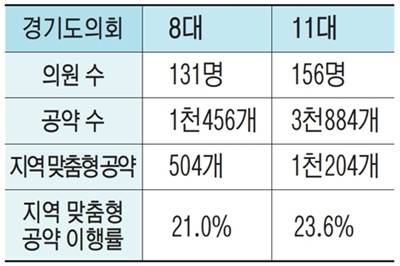 공약 개수의 경우, 현재 제11대 경기도의회 의원 중 비례대표와 보궐선거 당선자 총 20명을 뺀 136명의 전체 공약은 3천884개로 추려졌다. 과거 제8대 경기도의회 의원 중 교육의원 등 8명을 제외한 123명의 공약은 1천456개로, 지금과 2.6배 차이가 난다.