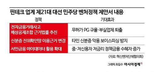 15일 금융권에 따르면 핀테크 업계는 이날 오후 서울 구로구 벤처기업협회에서 열리는 '더불어민주당-혁신벤처단체협의회 정책협약식'에서 8개 정책 건의안을 제출할 예정이다.