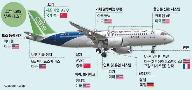C919는 중국에서 자국 항공기 산업의 자립을 목표로 개발한 항공기지만 여전히 주요 부품 대부분을 미국 업체에 의존하고 있다.