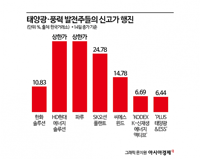 15일 금융투자업계에 따르면 한화솔루션(10.83%), HD현대에너지솔루션(상한가), 파루(상한가) 등 태양광 관련 주들은 전날 일제히 52주 신고가를 경신했다. SK오션플랜트(24.78%), 씨에스윈드(14.78%) 등 풍력 발전주들은 물론 'KODEX K-신재생에너지액티브' 'PLUS 태양광&ESS'와 같은 관련 상장지수펀드(ETF)들도 6%대 급등하며 수익률 톱5에 이름을 올렸다.