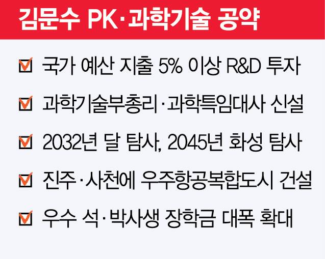 한편 국민의힘 정책총괄본부는 이날 김 후보의 경남 유세와 보조를 맞춰 우주·과학기술 공약을 발표했다. 이 가운데 2027년까지 발사체 엔진을 개발하고 2032년 달 착륙과 2045년 화성 탐사에 나선다는 ‘우주경제 로드맵’이 눈에 띈다. 또 국가 예산 지출의 5% 이상을 연구개발(R&D)에 투자하고 과학기술 부총리 및 과학특임대사 신설도 공약했다. 국가전략기술 R&D 예산을 5년 내 10조 원 규모로 확대하고 R&D 예비타당성조사를 폐지하는 방안도 포함됐다.