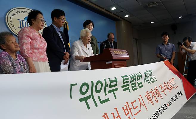 | ▲ 2016년 7월 21일 당시 유은혜 더불어민주당 의원의 부축을 받아 국회 정론관 마이크 앞에 선 이옥선 할머니는 "일본 정부는 역사를 왜곡하고 범죄를 정당화하며, 피해자 할머니들에게 씻을 수 없는 고통을 더하고 있다"며 "아베 총리가 진심으로 공식 사과하고 합당한 법적 배상을 이해하고 재발방지를 위한 대책을 마련해야 한다"고 힘주어 말했다. |