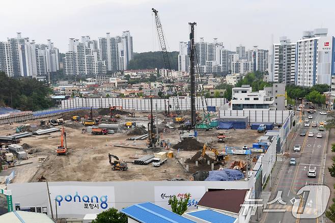 (포항=뉴스1) 최창호 기자 = 15일 경북 포항시 북구 두호동 동부초등학교 건너편 옛 캠프리비 부지에서 포항국제전시컨벤션센터 공사가 한창이다.
