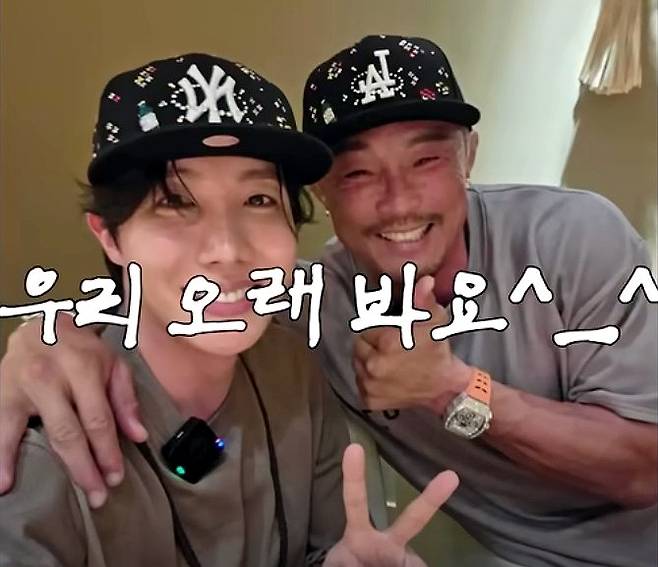 추성훈은 "이거 줄까?"라며 팔에 차고 있던 팔찌를 직접 풀어 제이홉의 팔에 채워줬다.