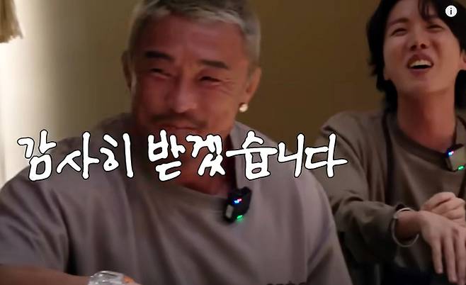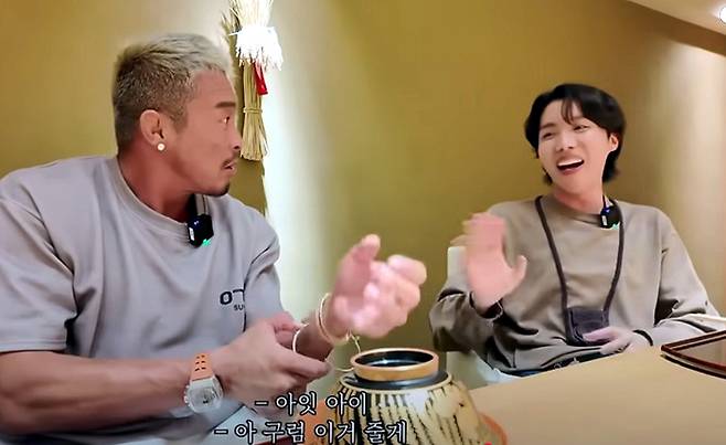 추성훈은 “이거 줄까?”라며 팔에 차고 있던 팔찌를 직접 풀어 제이홉의 팔에 채워줬다. 이어 “이거 지금 5000만원 정도 할걸?”이라고 말해 주변을 깜짝 놀라게 했다.