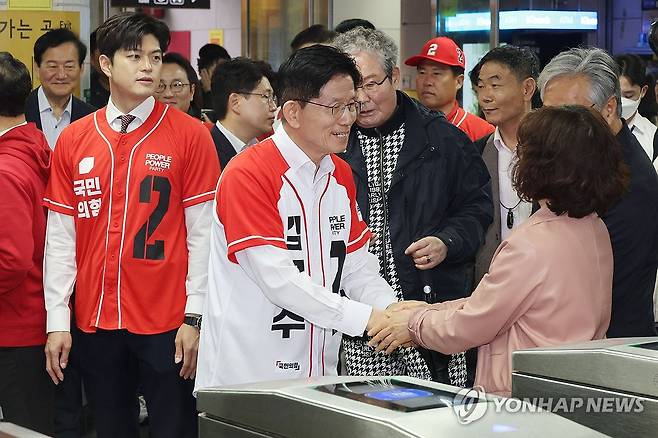 (서울=연합뉴스) 김도훈 기자 = 국민의힘 김문수 대선 후보가 15일 서울 구로구 신도림역을 찾아 시민과 인사를 나누고 있다. 2025.5.15 [공동취재]