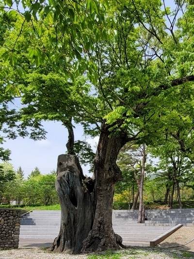 | ▲ 고목 썩은 속을 도려내고 보수제를 채워 넣어, 간신히 생명을 이어가고 있는 모습 |