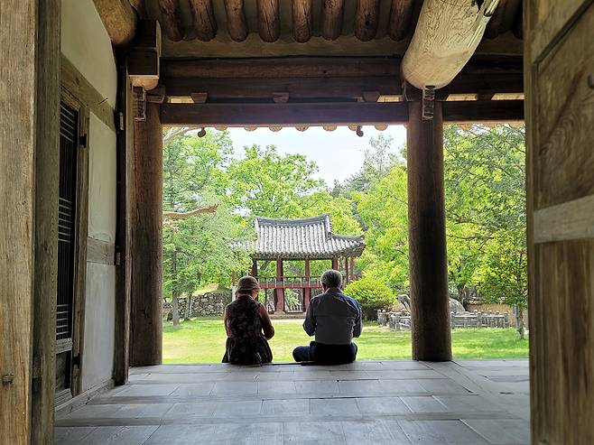 | ▲ 구연서원 노부부가 강당 마루에 앉아 유유자적 풍경을 즐기고 있는 모습 |