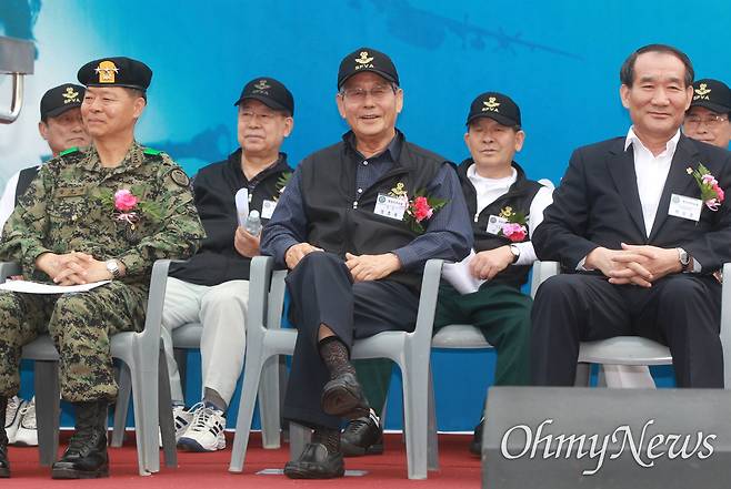 | ▲ 2012년 6월 24일 오전 서울 월드컵공원에서 열린 '제1회 특전사마라톤 대회' 개회식에서 12.12쿠데타, 5.18광주학살 관련자인 장세동 전 안기부장(뒷 줄 왼쪽에서 두번째)과 정호용 전 국방장관(가운데)이 특전사전우회 자문위원과 회장의 자격으로 연단에 앉아 있다. 정호용 전 국방장관 오른쪽에 당시 박승춘 국가보훈처장이 앉아 있다. |