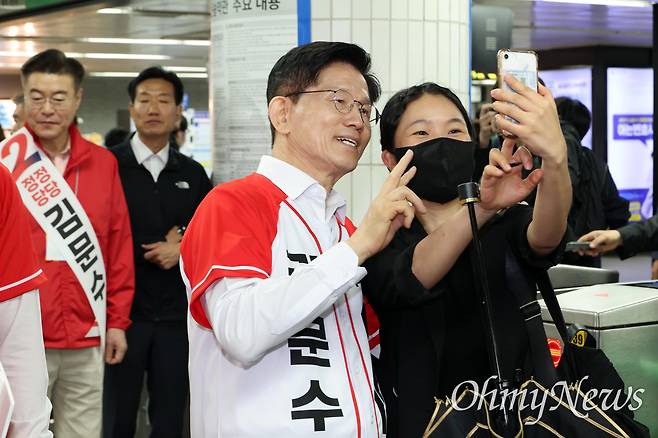 | ▲ 김문수 국민의힘 대통령 후보가 15일 서울 구로구 신도림역에서 출근길 시민들에게 인사를 하고 있다. |