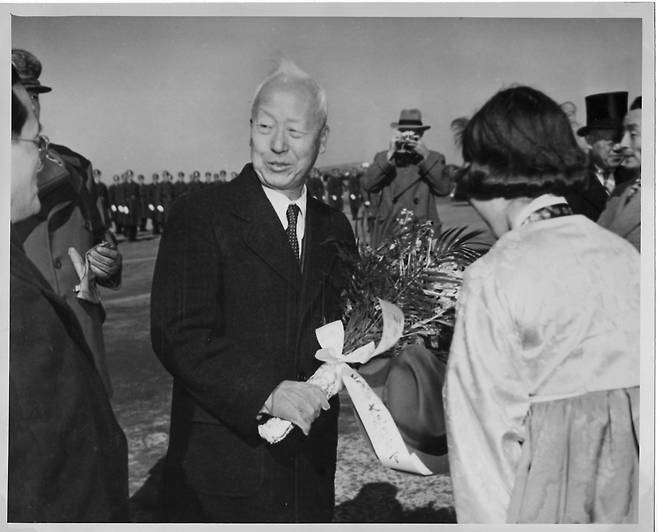 | ▲ 이승만 대통령이 도쿄 하네다 공항 출발에 앞서 재일 동포로부터 환송 꽃다발을 받고 있다(1950. 2. 18.). |