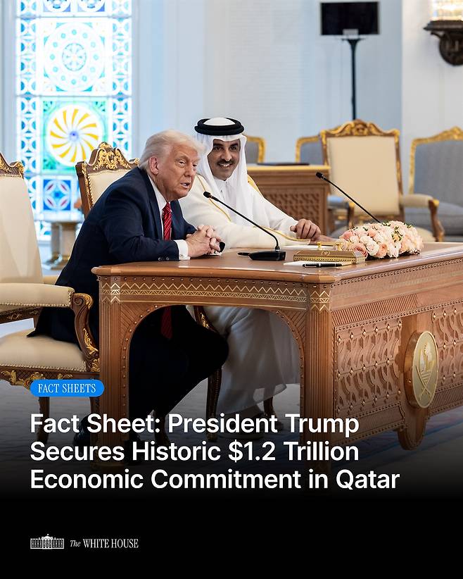 | ▲ 5월 14일(현지시각), 도널드 트럼프 미국 대통령은 카타르 도하에서 셰이크 타밈 빈 하마드 알사니 국왕과 회담을 갖고, 경제·안보 분야의 포괄적 협력 패키지에 대한 합의서에 서명했다고 밝혔다. 이는 백악관이 발표한 핵심 요약 자료 ‘팩트 시트(Fact Sheet)’를 통해 공식 확인됐다. |