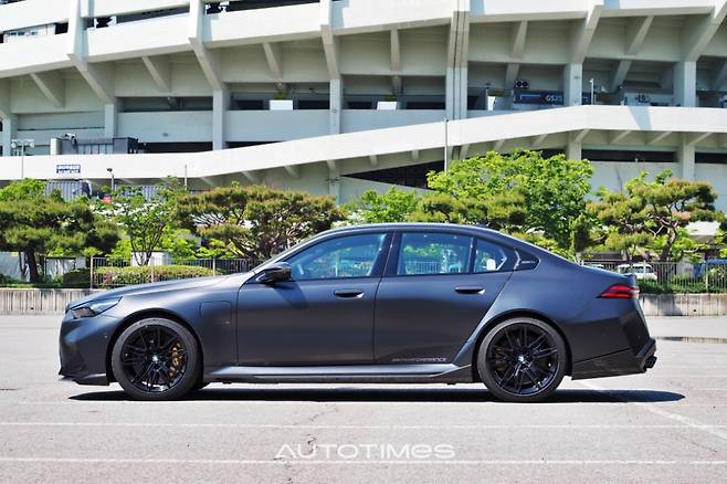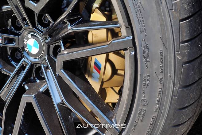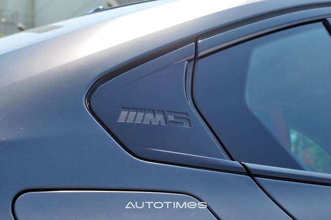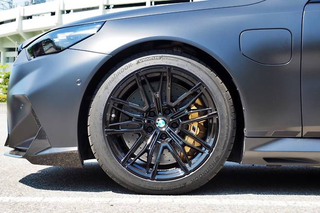 옆은 휠·타이어 조합이 압권이다. 20인치 블랙 휠과 함께 M5만을 위해 만든 한국타이어 벤투스 S1 에보 Z가 든든하게 다가온다. 안쪽에는 카본 세라믹 디스크 브레이크 및 골드 캘리퍼 조합으로 꾸몄다. 기능과 멋을 모두 충족시키는 아이템이다. 이 외에도 필러에 음각으로 새겨 넣은 M5 레터링과 하단부에 붙이 M 퍼포먼스 장식이 오너로서 자부심을 높인다.