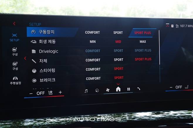 차를 가지고 노는 방법은 무궁무진하다. 센터 콘솔에 마련된 M하이브리드와 M모드, 셋업 버튼을 활용하면 수십 여 가지의 세팅이 가능하다. 먼저, M하이브리드는 다섯 가지의 모드를 지원한다.