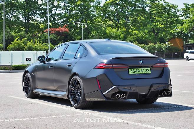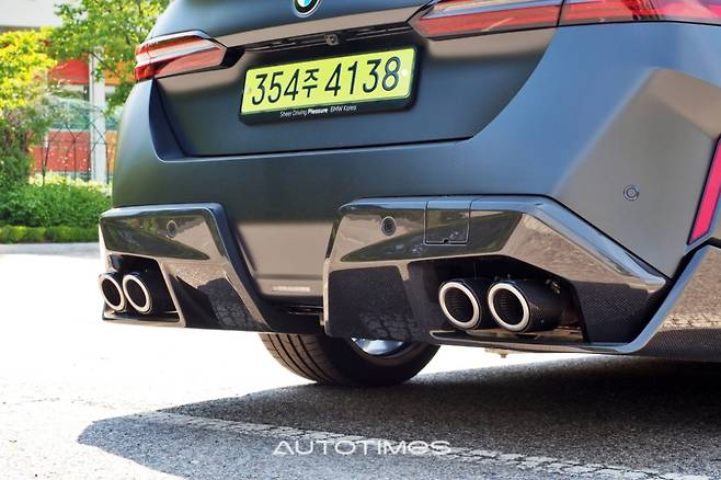 뒤는 가로로 얇은 테일램프가 특징이다. 트렁크 위쪽 끝 단에 붙여 기존 5시리즈와 완벽히 차별화 한다. 상대적으로 범퍼의 면적이 넓을 수 밖에 없는데 세로형 후방 반사판과 굵직한 쿼드 배기 시스템, 샤프한 캐릭터라인 등을 통해 밋밋함을 지우고 균형감 있게 구성했다.