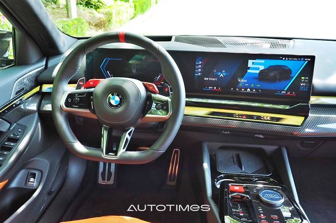 실내는 기존 신형 5시리즈 틀을 바탕으로 M카만의 요소를 적재적소에 넣었다. 12.3인치 풀-디지털 계기판과 14.9인치 센터페시아 통합 커브드 디스플레이는 가장 최신의 UI 구성을 바탕으로 선명하고 화려한 그래픽을 전달한다.