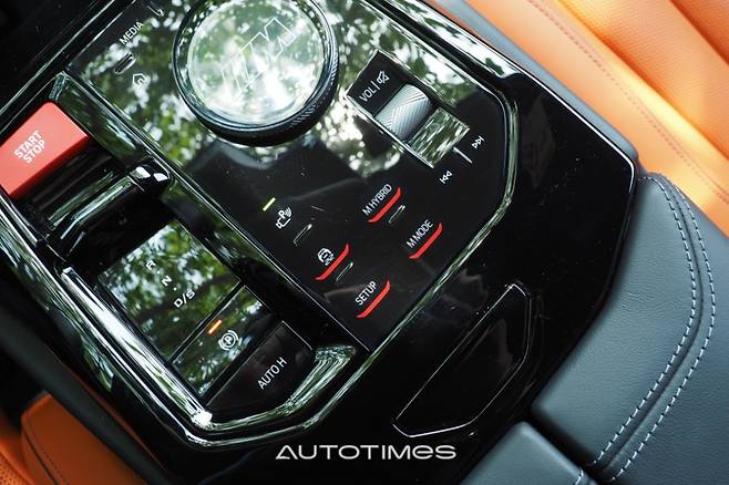 센터터널은 다소 높고 두껍다. 앞쪽에는 커다란 컵홀더와 두 개를 동시에 놓을 수 있는 휴대폰 무선 충전 패드가 있고 전자식 변속레버와 주행에 도움을 주는 기능들이 일목요연하게 배치돼 있다. 짧고 굵은 M 전용 변속레버가 사라진 것이 다소 아쉽지만 M5 로고가 투명 조그셔틀 안에 빛나는 것으로 위안을 삼는다.