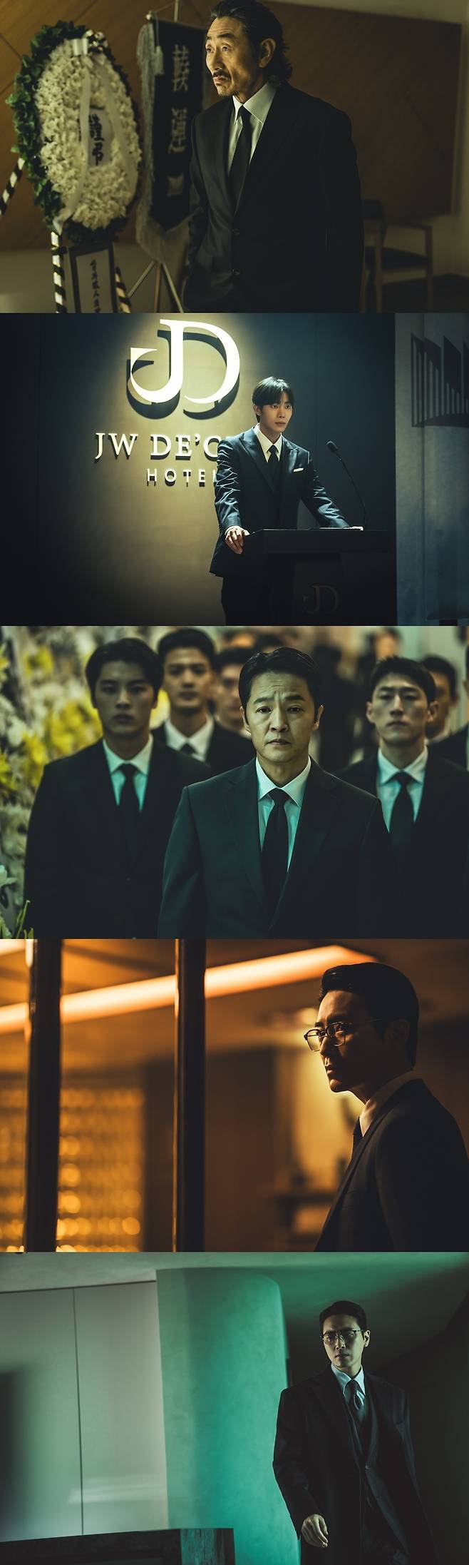 특히, 어떤 작품에서든 강렬한 존재감을 발산해온 허준호는 세밀한 내면 연기로 한 조직을 이끄는 수장으로서의 카리스마를 완벽하게 표현해 내 몰입감을 극대화시킬 전망이다. 마찬가지로 장례식장을 찾은 ‘이금손’(추영우)과 ‘최성철’(조한철)의 모습 역시 눈에 띈다. 일평생 조직을 이끌어 온 아버지 ‘이주운’과 달리, 조직에 몸담지 않고 자신의 길을 걷는 인물인 ‘이금손’은 최근 탄탄한 연기력을 입증한 추영우가 연기한다. ‘이주운’의 아들이기 전에 현직 검사로서 자신만의 야심을 품고 있는 ‘이금손’을 그려낼 추영우의 냉철한 모습은, 그의 새로운 연기 변신도 기대하게 한다.
