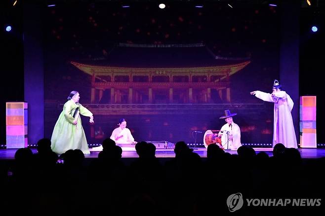 (서울=연합뉴스) 지난 14일 일본 오사카·간사이 만국박람회 공연장에서 명인들이 합동 공연을 펼치고 있다. 왼쪽부터 신영희 국가무형유산 판소리 보유자, 이재화 거문고 산조 보유자, 조용수 판소리(고법) 이수자, 채상묵 승무 보유자. 2025.5.15 [국가유산청 제공. 재판매 및 DB 금지]
