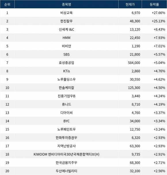 6위 SBS(034120)는 현재가 21,800원으로 5.57% 상승 중이다. 7위 효성중공업(298040)은 현재가 584,000원으로 5.04% 상승 중이다. 8위 KTis(058860)는 현재가 2,860원으로 4.76% 상승 중이다. 9위 노루홀딩스우(000325)는 현재가 30,550원으로 4.62% 상승 중이다. 10위 한솔케미칼(014680)은 현재가 125,300원으로 4.50% 상승 중이다.
