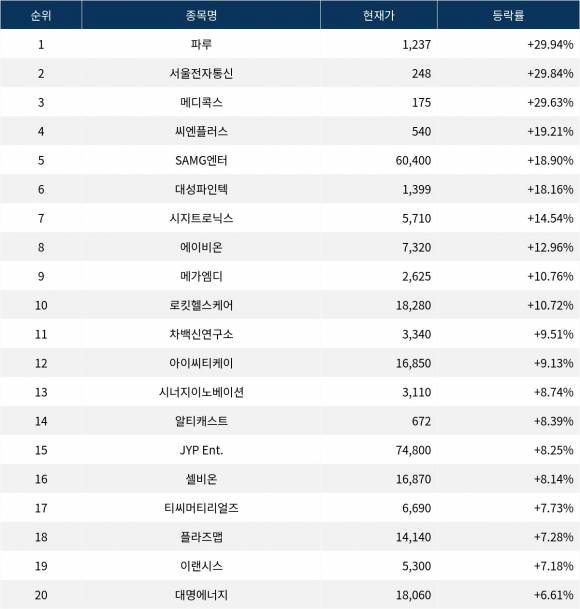 [서울데이터랩]파루 29.94% 폭등…실시간 상승률 1위
