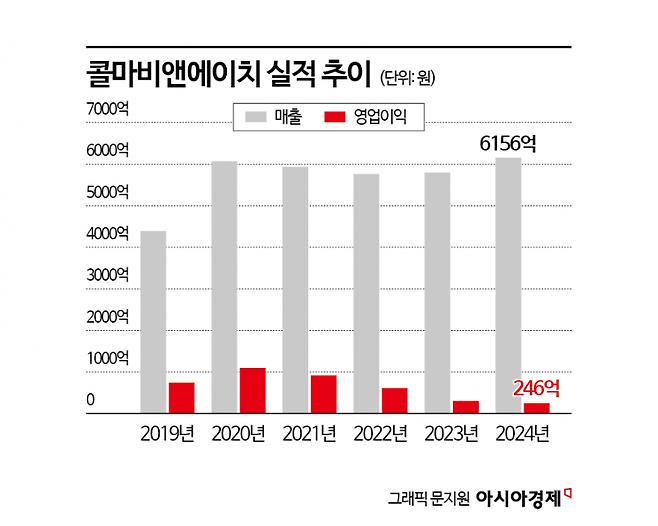 콜마비앤에이치는 건기식 제조업자생산(ODM)과 화장품 원료를 개발·생산하는데, 전체 매출의 60%가량은 건기식에서 발생한다. 윤 대표가 취임한 2020년 이 회사의 매출액은 6069억원에서 이듬해부터 역성장한 뒤 지난해 6165억원으로 회복했다. 이 기간 영업이익은 1092억원에서 246억원으로 쪼그라들었다. 코로나19 팬데믹(세계적 대유행)을 기점으로 건기식 수요가 증가했는데, 엔데믹(감염병 주기적 유행) 이후 내수 부진과 건기식 ODM 시장의 과열 경쟁으로 수익성이 크게 후퇴한 것이다.
