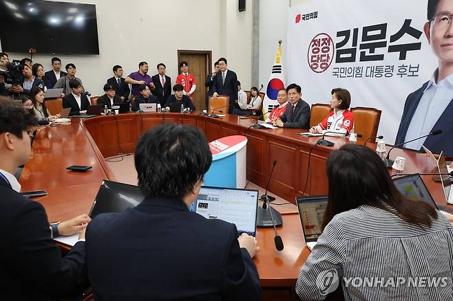 (서울=연합뉴스) 김주형 기자 = 국민의힘 김문수 대선 후보가 15일 서울 여의도 국회에서 열린 중앙선거대책위원회 회의를 마친 후 긴급 기자회견을 하고 있다. 2025.5.15