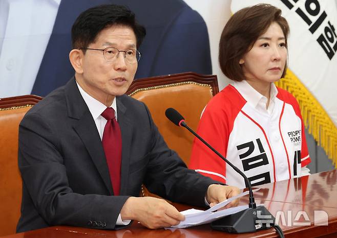 [서울=뉴시스] 조성우 기자 = 김문수(왼쪽) 국민의힘 대선후보가 15일 오전 서울 여의도 국회에서 열린 긴급 기자회견에서 발언하고 있다. 오른쪽은 나경원 공동선대위원장. 2025.05.15. xconfind@newsis.com