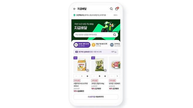 CU편의점의 경우 오전 11시부터 오후 11시까지 1만 원 이상 구매 시 편의점이 자체적으로 확보해 운영 중인 이륜차 배달망을 통해 1시간 내외로 배송해 준다.