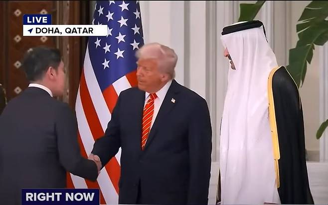 [지난 14일(현지시간) 셰이크 타밈 빈 하마드 알사니 카타르 군주가 주최한 국빈만찬에 앞서 트럼프 트럼프 대통령과 악수하는 정용진 신세계그룹 회장. (미 ABC방송 유튜브 화면 갈무리=연합뉴스)]
