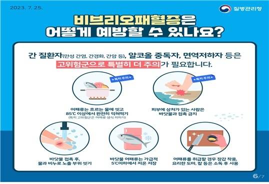 감염을 막기 위해선 어패류는 5도 이하로 저온 저장해 85도 이상에서 충분히 익혀 먹고, 피부에 상처가 있는 경우엔 바닷물 접촉을 피하는 등 예방수칙 준수가 중요하다.