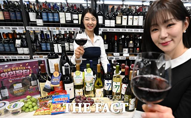 [더팩트ㅣ이새롬 기자] 이마트 상반기 최대 규모 와인 할인 행사인 와인 장터를 하루 앞둔 15일 서울 용산구 이마트 용산점에서 모델들이 와인을 선보이고 있다.