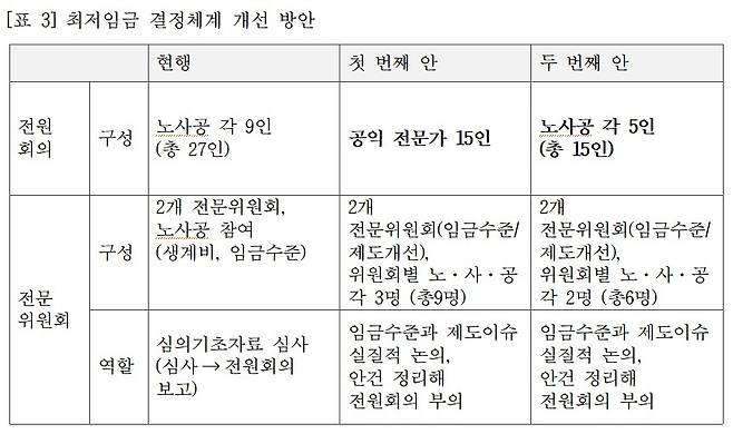 위원 구성은 공익 전문가 15인으로만 구성하는 안과 현행 근로자위원·사용자위원·공익위원으로 구성하는 방식을 따르되 각 9인에서 5인으로 축소하는 두 가지 안을 우선순위 없이 함께 제안했다.