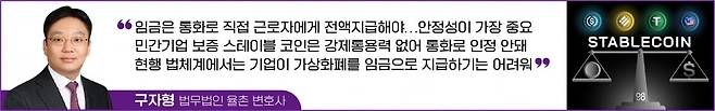 만약 스테이블 코인이 정식으로 허용된다면 이러한 문제를 해결할 수 있을까? 스테이블 코인은 일반적으로 특정 법정화폐(예: 미국 달러)에 연동되어 가격이 안정되도록 설계된 가상자산이다. 대선 주자나 일부 정치권에서는 중앙은행 디지털화폐(CBDC)의 논의와 함께 원화 기반 스테이블 코인의 가능성도 언급하고 있고, 한국은행 역시 스테이블 코인에 대한 연구를 진행 중이다. 다만, 민간 기업이 보증하는 스테이블 코인은 국가가 발행하는 법정통화와는 달리 법적 강제통용력이 없기 때문에, 원화를 기초자산으로 하는 스테이블 코인의 발행이 허용되더라도 여전히 근로기준법상 ‘통화’로 인정되지 않을 가능성이 높다.